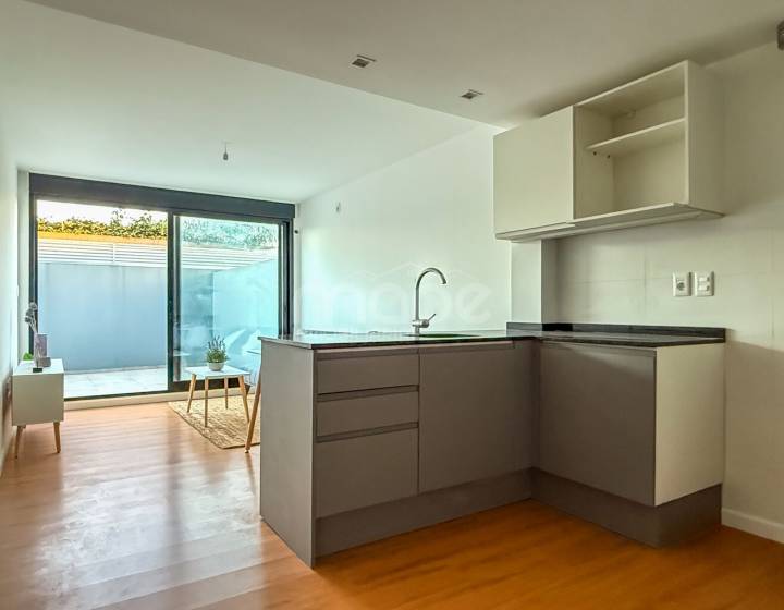 - Cocina integrada con muebles aéreos, bajo mesada y mesadas de granito negro con piletas de acero inoxidable y grifería monocomando.