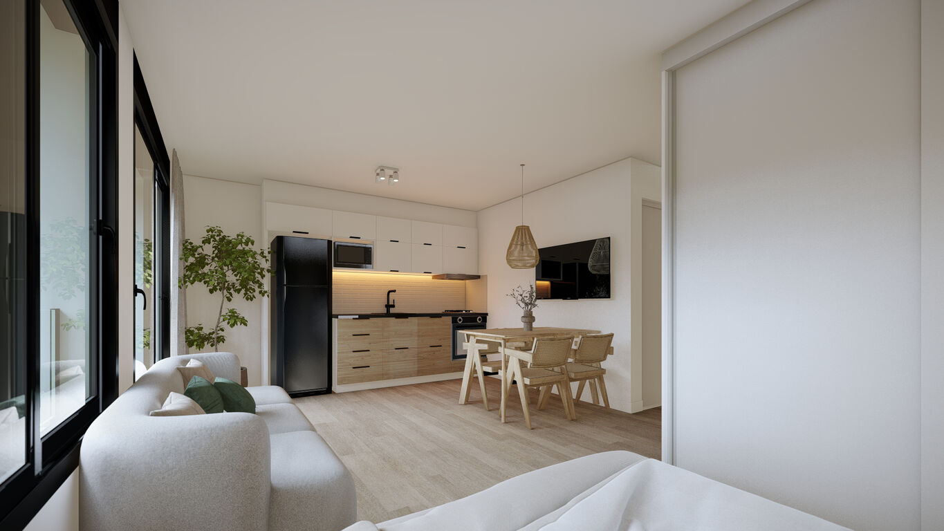 El apartamento cuenta con living comedor amplio y luminoso, cocina integrada, baño completo y una terraza con parrillero exclusivo, ideal para disfrutar al aire libre. Se destaca por sus terminaciones de calidad: doble vidrio DVH, persianas automáticas, pisos vinílicos y porcelanatos, además de muros de ticholos rebocados que garantizan solidez y aislación.