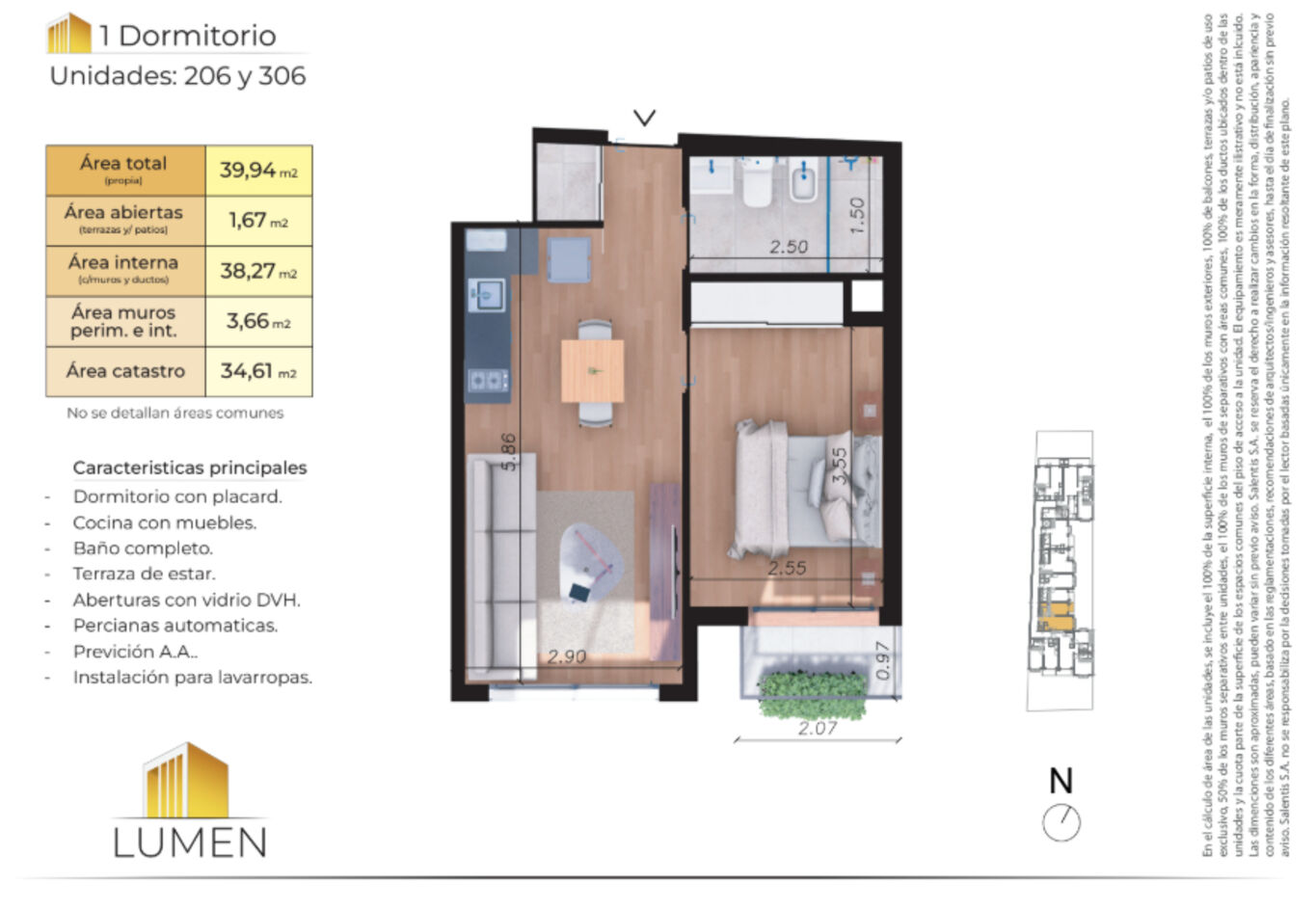 El apartamento cuenta con living comedor amplio y luminoso, cocina integrada, baño completo, un dormitorio y una terraza con parrillero exclusivo, ideal para disfrutar al aire libre. Se destaca por sus terminaciones de calidad: doble vidrio DVH, persianas automáticas, pisos vinílicos y porcelanatos, además de muros de ticholos rebocados que garantizan solidez y aislación.