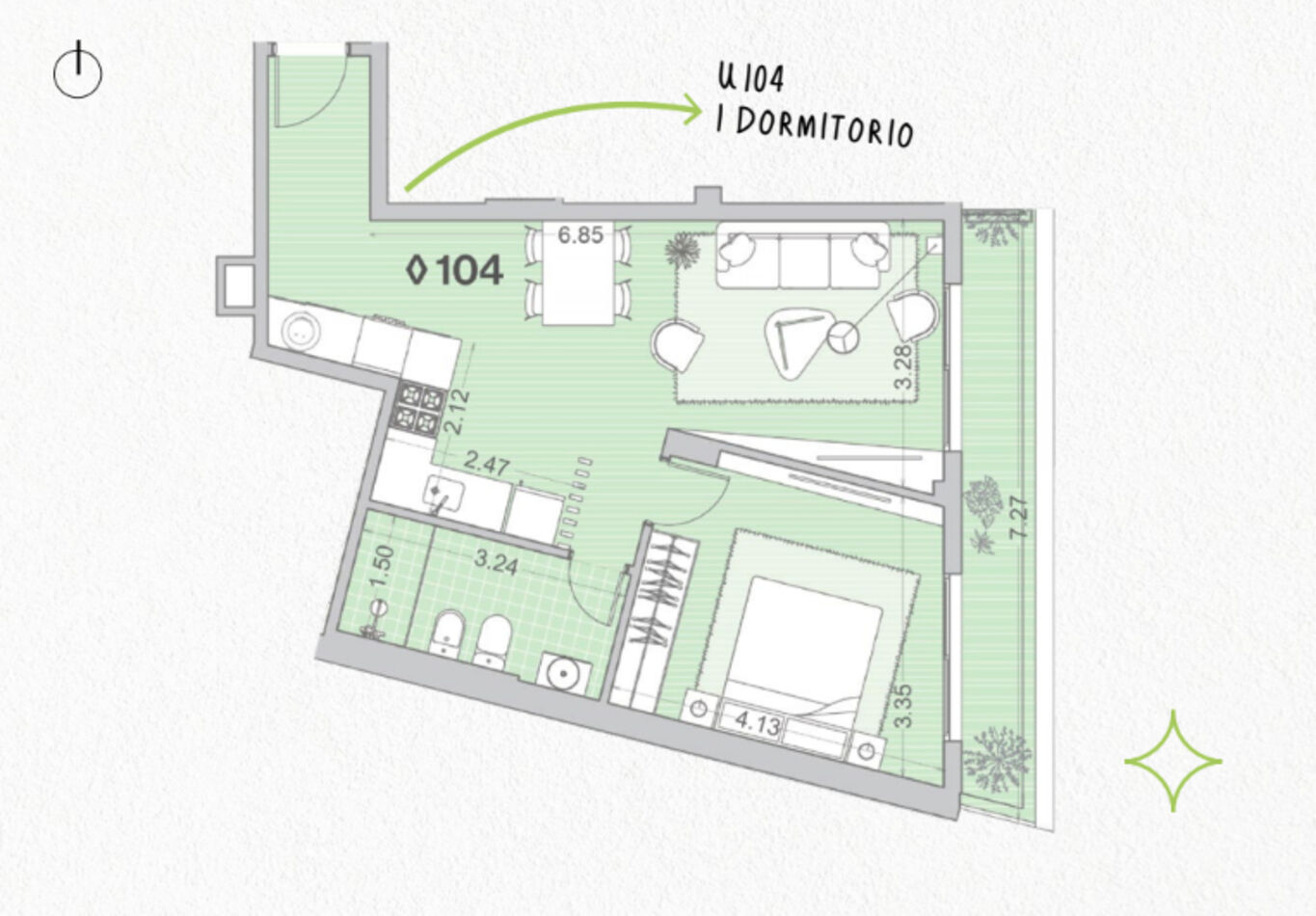 Este apartamento de 1 dormitorio cuenta con una distribución funcional, amplios ventanales y una terraza que aporta luz y amplitud a los espacios.
