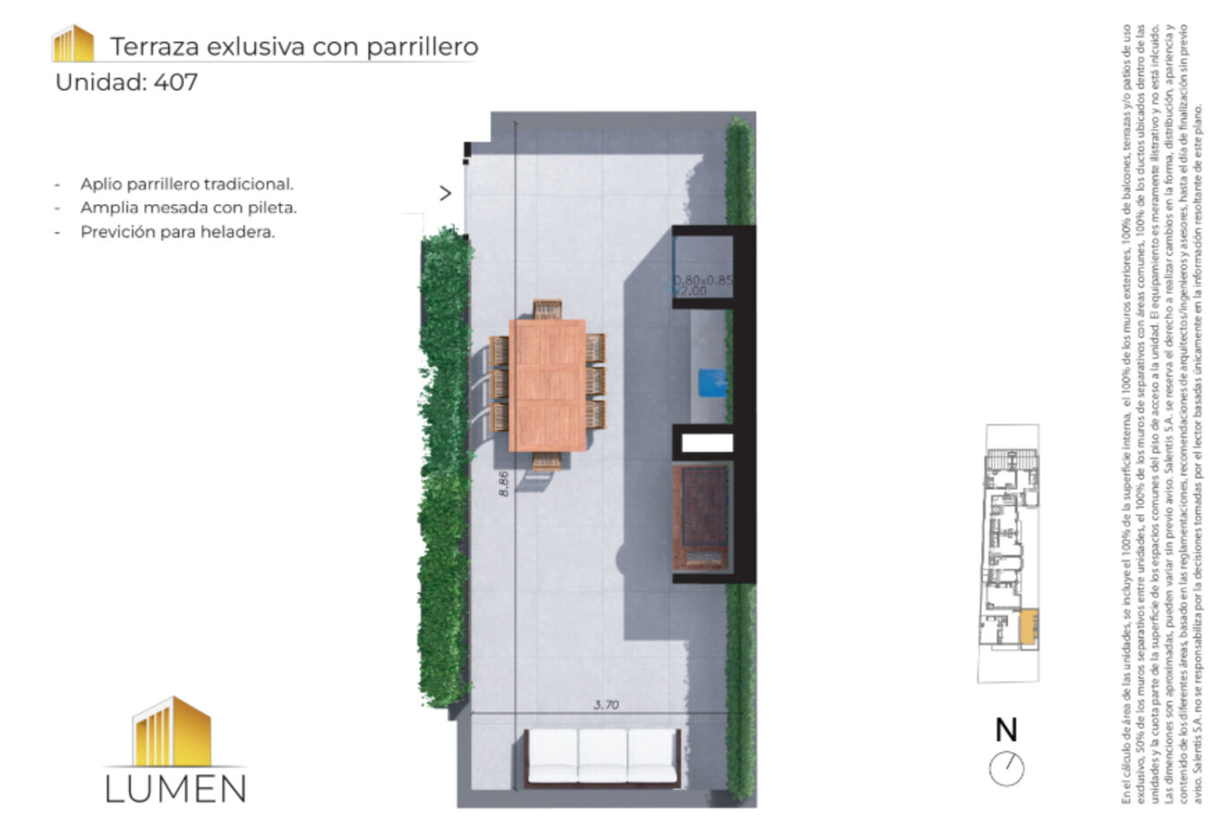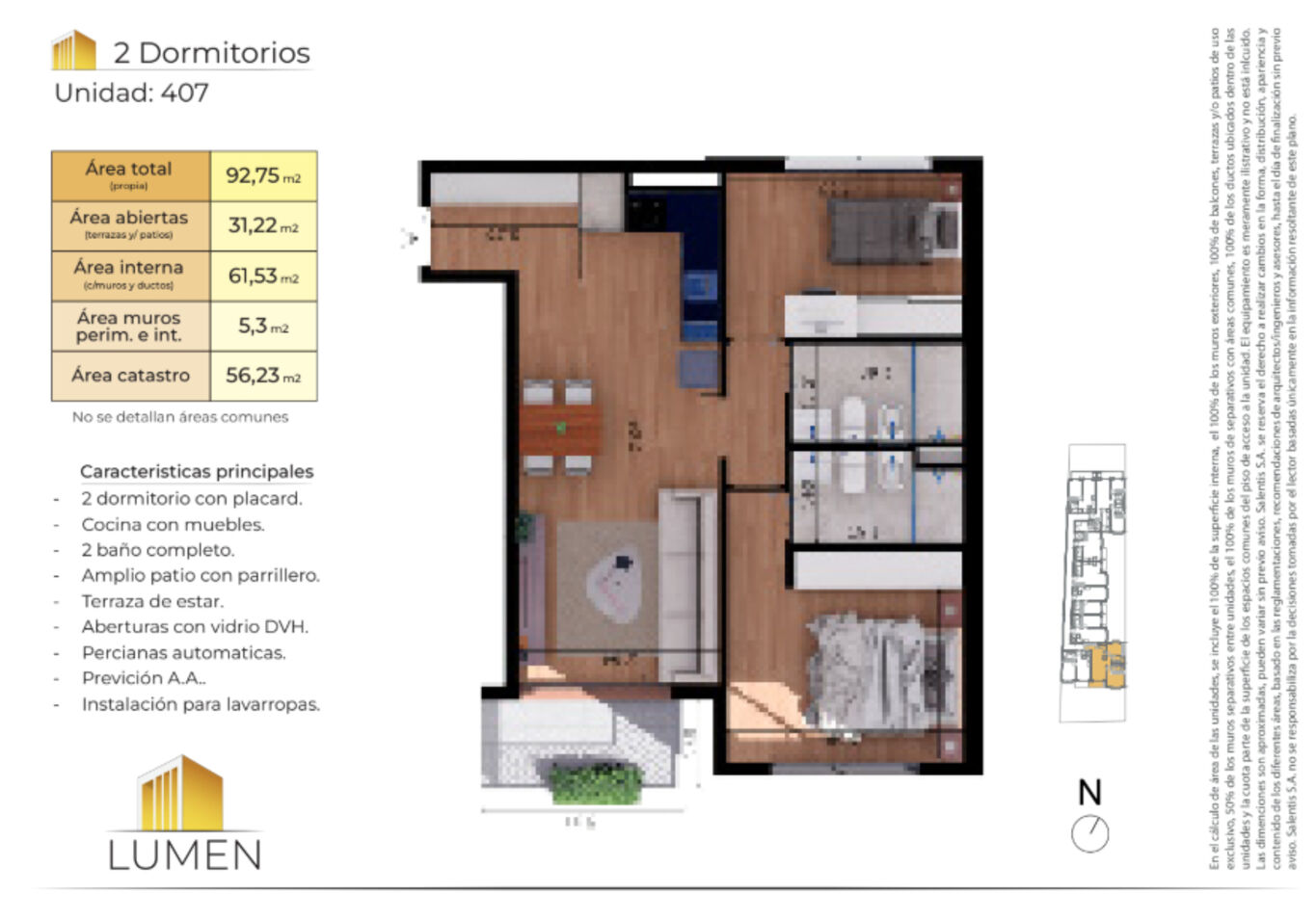 La unidad cuenta con una distribución funcional, living comedor amplio, cocina integrada, dos baños completos , dos dormitorios y terraza propia.